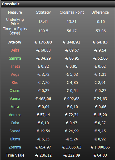 Vengono mostrati i valori delle greche e dell'atnow. La prima colonna indica i valori di partenza della strategia, la seconda colonna mostra i valori corrispondenti al punto ove si trova il puntatore del mouse, la terza colonna mostra la differenza tra le precedenti.