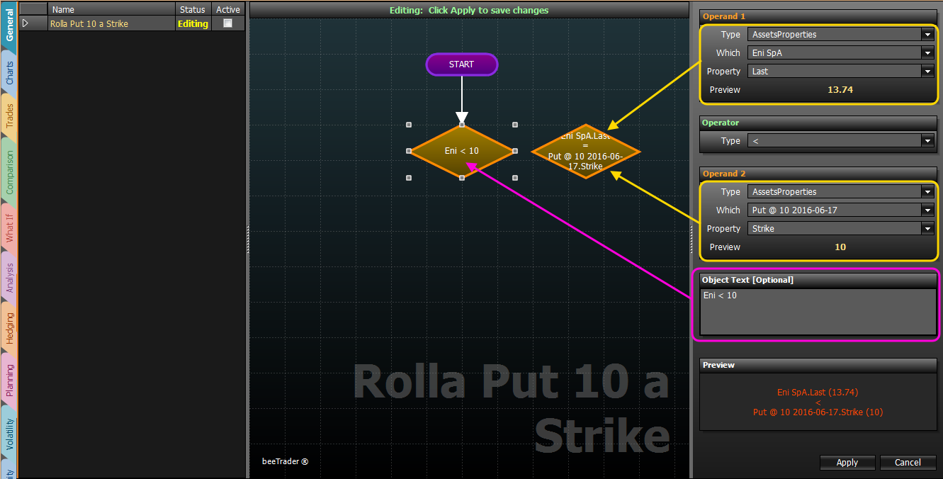 In Operand 1 si sceglie AssetsProperties → Eni → Last (la Preview mostra il valore corrente), in Operator di sceglie ⇐, in Operand 2 si sceglie AssetsProperties → La Put 10 → Strike (la Preview mostra il valore corrente).